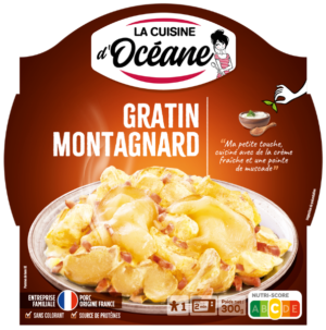 Pommes de terre 44%, lardons fumés 13% [poitrine de porc (origine : France), eau, sirop de glucose, sel arômes naturels, condiments, ferments], eau, fromage à tartiflette 10% (lait de vache, sel, ferments lactiques et d’affinage, enzyme coagulante, conservateur : E235), oignons 8%, crème fraîche 5% (crème, ferments lactiques), farine de blé, poudre de lait entier (lait écrémé, crème), huile de colza, sel fin, ail 0,2%, oignons en poudre, muscade 0,04%, poivre noir, curcuma.
